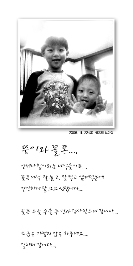 완전 개구쟁이같아요^^; 그까짓 병쯤은 충분히 이겨낼 수 있겠어요 애기들을 믿고 힘내세요~