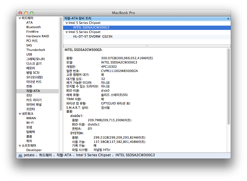 - hdd: intel SSD 300G(G3 320)로 교체했습니다.